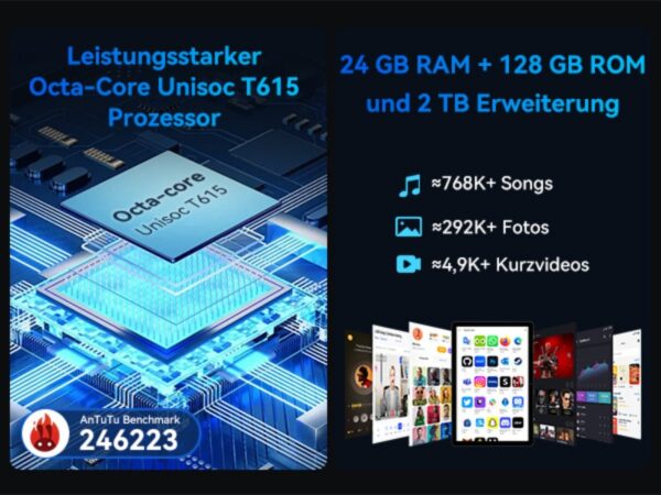 Schon beim ersten Einschalten fällt auf, wie geschmeidig das TABWEE T90 auf Eingaben reagiert. Kein Wunder: Unter der Haube werkelt ein Unisoc T615 Octa-Core-Prozessor, der mit bis zu 2,0 GHz taktet. Unterstützt wird dieser von satten 24 GB RAM – aufgeteilt in 8 GB physischen und 16 GB dynamisch zugewiesenen Speicher. Diese Kombination ermöglicht blitzschnelle App-Starts, nahtloses Multitasking und eine durchweg flüssige Benutzererfahrung. Selbst grafikintensive Spiele und anspruchsvolle Produktivitätsanwendungen laufen absolut ruckelfrei.