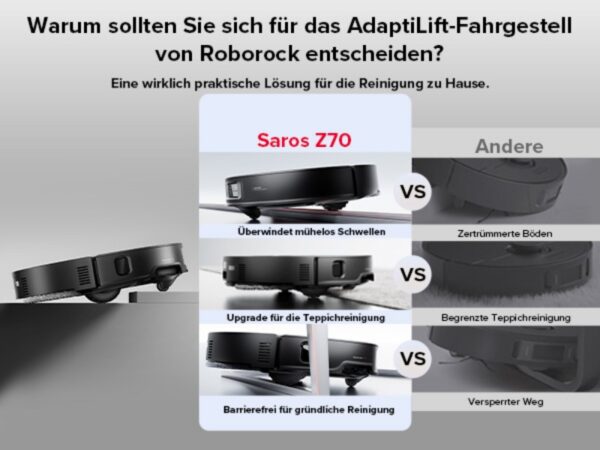 Unser Plus: Der Roborock Saros Z70 ist der beste multifunktionale Saugroboter, den wir bis dato testen durften – eine echte Revolution für alle, die höchste Ansprüche an Sauberkeit, Technik und Komfort stellen.