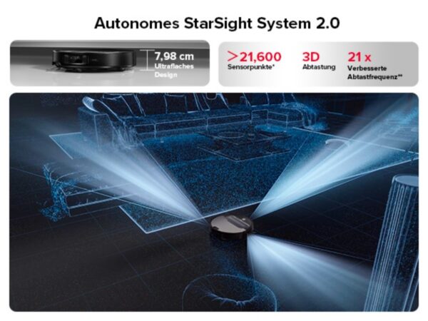 Herzstück der Navigation des Roborock Saros Z70 ist das StarSight System 2.0 – eine Weiterentwicklung der ohnehin schon beeindruckenden Hindernisvermeidung der Vorgängermodelle. Mithilfe einer Kombination aus vertikalen Laser-Scannern, Doppelkamera und KI-gestützter Objekterkennung navigiert der Roboter absolut selbstständig durch jede Umgebung. Dank maschinellem Lernen erkennt der Z70 bis zu 108 unterschiedliche Hindernistypen, darunter Möbelbeine, Kabel, Haustierspielzeug oder herunterhängende Textilien. Die Integration der VertiBeam-Technologie sorgt zusätzlich dafür, dass auch besonders niedrige oder seitliche Hindernisse zuverlässig erfasst werden. In der Praxis bedeutet das: weniger Zusammenstöße, keine verkanteten Fahrten und eine effizientere Reinigungsroute.