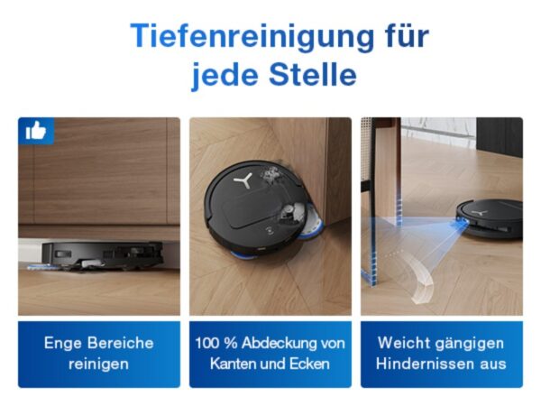 Diese schlanke Eleganz wird durch intelligente Bauweise und präzise Navigation unterstützt. Selbst an Stellen, die schwer einzusehen sind, reinigte der Roboter zuverlässig – als hätte er ein eigenes Gespür für versteckten Schmutz. Für Haushalte mit vielen Möbeln ist das ein echter Gamechanger. So viel Tiefenreinigung in so wenig Höhe haben wir noch nie erlebt.