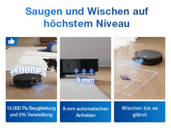 Die enorme Saugleistung von bis zu 15.000 Pa sorgt in Kombination mit der optimierten Bürstentechnologie für eine effektive Schmutzbeseitigung – ganz gleich ob auf Hartboden oder Teppich. Dank intelligenter Teppicherkennung werden Wischmopps automatisch angehoben, um textile Flächen zu schonen. Die Kantenreinigung wurde ebenfalls weiterentwickelt: Mit der ausfahrbaren Seitenbürste erreicht der Roboter auch schwer zugängliche Ecken und Ränder sehr zuverlässig.