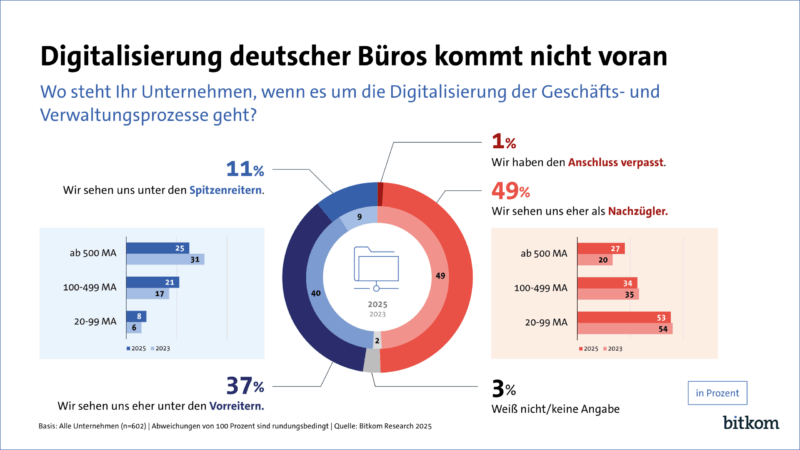 Für die eher zögerliche Annahme der Künstlichen Intelligenz in den deutschen Büros gibt es verschiedene Gründe. So stößt die Technologie auf Widerstand in der Belegschaft: Gut die Hälfte der Unternehmen nimmt seine Beschäftigten einem KI-Einsatz gegenüber als skeptisch wahr (53 Prozent). Drei Viertel der Unternehmen warten zudem erst einmal ab, welche Erfahrungen andere dabei machen (75 Prozent). Darüber hinaus wird auch der erwartete Nutzen kritisch gesehen: Denn die Hälfte glaubt, der Einsatz von KI in den Geschäfts- und Verwaltungsprozessen lohne sich nicht (50 Prozent). „Abwarten ist bei einer Technologie wie der Künstlichen Intelligenz die falsche Strategie – wer zu spät einsteigt, läuft Gefahr, den Anschluss zu verlieren. Unternehmen müssen jetzt anfangen, KI-Lösungen einzuführen und Mitarbeitende entsprechend auszubilden“, so Rohleder. „Auch mit Blick auf die Digitalisierung im Allgemeinen ist es unerlässlich, schnell aufzuholen: Unternehmen sollten ihre Abläufe systematisch auf Einsatzmöglichkeiten für digitale Anwendungen überprüfen. Nach dem Prinzip ‚Digital First‘ gilt es, für neue Prozesse direkt digitale Lösungen einzuführen – und auf allen Ebenen die Akzeptanz und Kompetenz zu fördern, um entsprechende Technologien sinnvoll zu nutzen“.