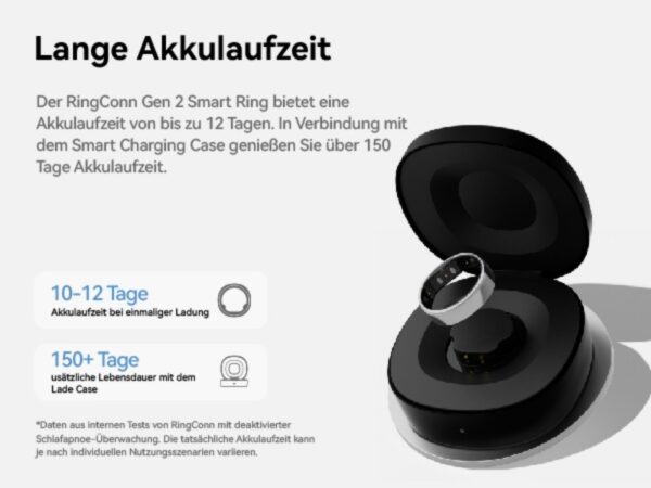 Hinzu kommen praktische Vorteile: Bis zu 12 Tage Akkulaufzeit mit Schnellladung, Bluetooth 5.0 mit stromsparendem Modul und Kompatibilität mit Apple Health sowie Google Fit. Die Farben Future Silver, Mattschwarz, Royal Gold und Roségold bieten für jeden Geschmack das passende Modell. Die mitgelieferte Ladebox, das USB-C-Kabel und ein kostenloses Größenset runden das Angebot ab. RingConn Gen 2 steht für durchdachte Technik im perfekten Design.