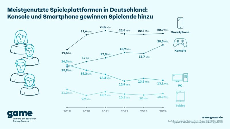 Die Spielekonsole nähert sich dem Spitzenplatz der beliebtesten Gaming-Plattformen in Deutschland an: Rund 20,5 Millionen Deutsche spielten 2024 auf der Konsole und damit so viele wie nie zuvor. Noch im Jahr davor waren es 18,7 Millionen. Insgesamt hat die Spielekonsole in den vergangenen Jahren eine starke Entwicklung genommen – seit 2019 ist die Anzahl der Konsolen-Spielenden in Deutschland um 29 Prozent gewachsen. Dazu trägt die große Popularität der aktuellen Konsolengeneration rund um PlayStation, Xbox oder Nintendo Switch bei, innerhalb derer auch neue, technisch optimierte Versionen erschienen sind – etwa die PlayStation 5 Pro oder das OLED-Modell der Nintendo Switch. Das gab heute der game – Verband der deutschen Games-Branche auf Basis von Daten von YouGov bekannt. Meistgenutzte Spieleplattform in Deutschland bleibt das Smartphone, dessen Erfolg sich ebenfalls fortsetzt: So spielen rund 22,9 Millionen Menschen in Deutschland Games auf dem Handy. Dabei gewinnt das Smartphone innerhalb von zwölf Monaten 200.000 Spielende hinzu.