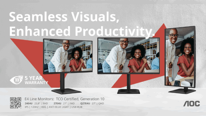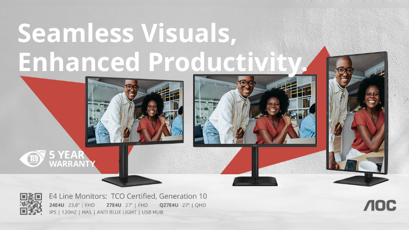 Optimal für produktives Arbeiten: die E4-Serie von AOC mit 5 Jahren Garantie und TCO Certified, generation 10