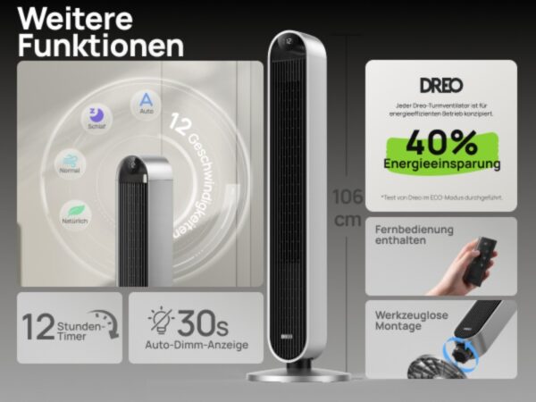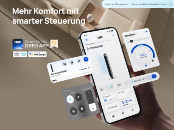 Gerade im Alltag macht es einen großen Unterschied, wenn sich Geräte flexibel und ohne Umstände bedienen lassen. Bei diesem Turmventilator von Dreo genügt ein kurzer Sprachbefehl an Alexa oder Google Home, und schon passt sich der Luftstrom den eigenen Wünschen an. Auch über die Dreo-App lässt sich der Ventilator bequem steuern – egal ob man gerade gemütlich auf dem Sofa sitzt oder sich in einem anderen Raum befindet. Diese smarte Integration sorgt für ein hohes Maß an Komfort und unterstreicht den modernen Charakter des Geräts.