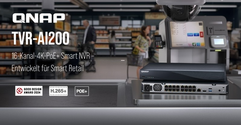 QNAP Systems, Inc., ein führender Innovator von Computer-, Netzwerk- und Speicherlösungen, hat den neuen 16-Kanal PoE+ Netzwerk Smart NVR TVR-AI200 präsentiert. Das Gerät unterstützt Video-/Audioüberwachung in Echtzeit, hochwertige Aufnahmen und kann sowohl auf einem Desktop als auch in einem Rack installiert werden. Mit PoE+ Netzwerk und Plug-and-Play Funktionen vereinfacht das TVR-AI200 nicht nur die Verkabelung und Installation der Kameras, sondern ermöglicht es den Nutzern auch, die Offline-Einrichtung innerhalb von 10 Minuten abzuschließen und mit der Aufnahme zu beginnen. Das TVR-AI200 kombiniert die Sicherheit eines isolierten Netzwerks mit flexiblen Verwaltungsfunktionen für optionale WAN-Konnektivität. In Verbindung mit KI-Videoanalysen und zentralen Verwaltungsfunktionen bietet es eine hocheffiziente, zuverlässige und günstige Überwachungslösung für intelligente Einzelhandels- und Geschäftsumgebungen.
