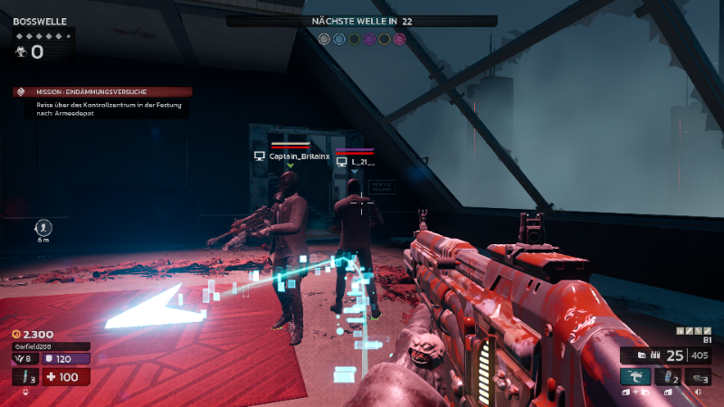 Zu Beginn starten alle mit einfacher Ausrüstung und muss sich der ersten Welle stellen. Anfangs kommen nur ein paar Zeds auf euch zu, die schnell erledigt sind. Am oberen, linken Bildschirm wird der Fortschritt der laufenden Welle angezeigt. Einmal die verbleibende Anzahl an Gegnern und welche Welle aktiv ist. Das ist besonders informativ, wenn man einer bestehenden Runde beitritt.