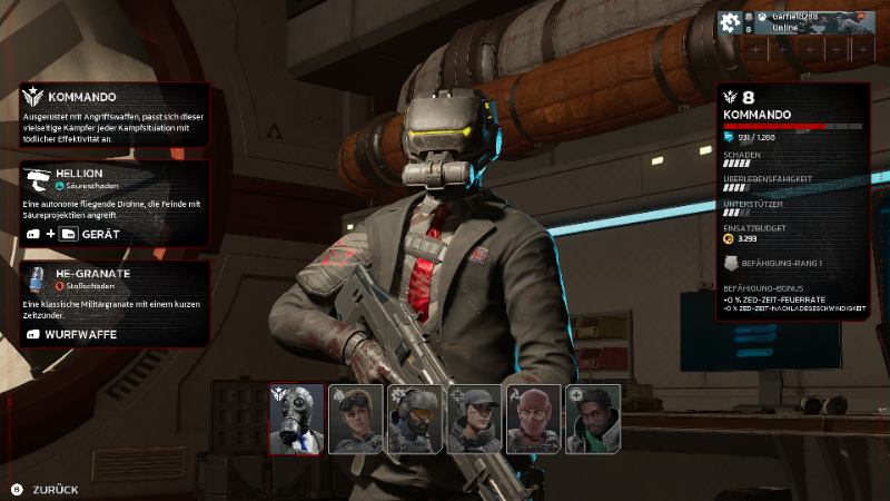 In diesem Hub legen wir unsere Klasse fest und können zudem auch Waffen konfigurieren, die sich im späteren Spielverlauf der Missionen kaufen und ausrüsten lassen.