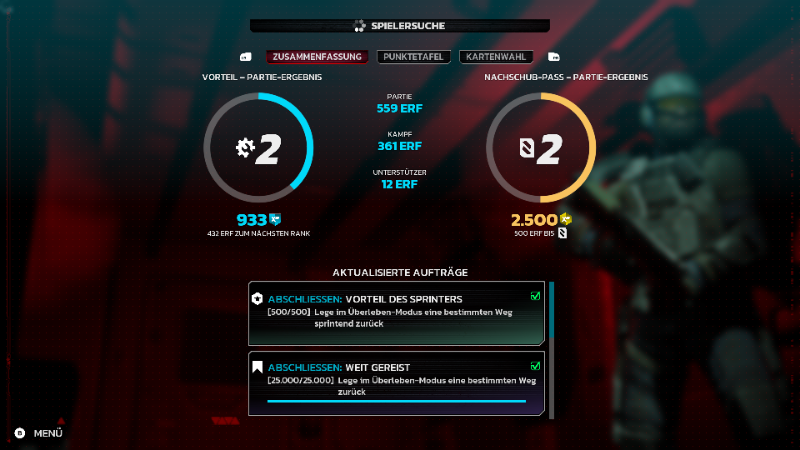 Egal ob ihr Erfolg habt oder scheitert, am Ende wird abgerechnet und es warten entsprechend eures Erfolges die Erfahrungspunkte. Dabei gehen die Erfahrung-/Fähigkeitsspunkte immer zu Gunsten der gespielten Klasse. Soll heißen, dass ihr mit eurem Feuerteufel bereits ein hohes Level habt, aber auf der anderen Seite der Ingenieur (den du noch nicht gespielt hast) auf Level 1 bleibt. Das hängt damit zusammen, dass jede Klasse einen eigenen Fähigkeitenbaum hat und die zusätzliche Ausrüstung nach und nach freigeschaltet werden kann.