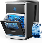 •  Intuitive Sicht- und Statusanzeige: Countdown-Timer mit Restzeit bis zur Eisfertigstellung, transparenter Wassertank und Eiskorb für den schnellen Füllstands-Check sowie Status-LEDs für klare Betriebsinformationen.