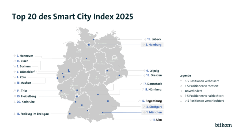 „Der Smart City Index macht die vielfältigen Bemühungen der engagierten Kommunalvertreterinnen und -vertreter und Bürgerinnen und Bürger sichtbar. Die Botschaft ist: Nicht nur die großen Metropolen können Smart City, jede Stadt kann smarter werden“, so Rohleder. Erstmals stellt Bitkom online neben den Detailergebnissen der Städte auch eingereichte Best-Practice-Beispiele zur Smart City vor. „Wir müssen verstärkt etablierte digitale Lösungen fördern und in die Breite bringen“, sagt Rohleder. „Und wir brauchen einen Bewusstseinswandel. Digitale Daseinsvorsorge ist kein Nice-to-have, sondern eine staatliche Kernaufgabe. Das bedeutet auch: Die Smart City muss dauerhaft finanziert werden und darf nicht an kurzfristigen Projektlaufzeiten hängen.“ Zudem fordert Bitkom, den Smart-City-Stufenplan aus dem Juni 2024 zeitnah umzusetzen und eine innovationsfreundliche Vergabe zu ermöglichen, damit Kommunen insbesondere auch von den digitalen Angeboten von Startups und kleinen Unternehmen profitieren können, die sich bislang häufig gar nicht um öffentliche Aufträge bewerben oder bewerben können.