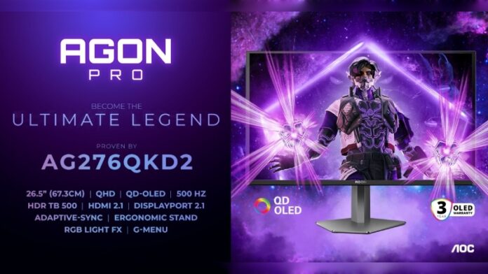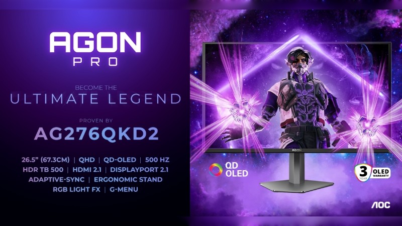 AGON by AOC – die weltweit führende Marke für Gaming-Monitore – präsentiert den AGON PRO AG276QKD2. Der bahnbrechende 67,3 cm (26,5“) QD-OLED-Gaming-Monitor bringt alles mit, was das ambitionierte Gamer-Herz höher schlagen lässt, darunter ein hochmodernes QD-OLED-Panel der 3. Generation, eine Bildwiederholrate von 500 Hz, blitzschnelle Reaktionszeiten von bis zu 0,03 ms GtG sowie überragenden Kontrast und Farbgenauigkeit. Mit zukunftssicheren Technologien wie DisplayHDR True Black 500 und modernster DisplayPort-2.1-Konnektivität setzt das Display neue Maßstäbe im Wettkampfbereich.