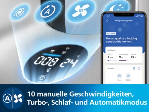 Technisch steckt dahinter eine Kombination aus moderner KI-Technologie und präzisen AeraSense-Sensoren. Diese erfassen Feinstaubpartikel (PM2,5), Allergene, flüchtige organische Verbindungen (VOCs), Temperatur und Luftfeuchtigkeit in Echtzeit. Alle Werte lassen sich bequem über die Philips Air+ App abrufen und steuern – egal ob man zuhause oder unterwegs ist. Darüber hinaus ist der Air Performer mit Alexa und Google Assistant kompatibel, sodass auch Sprachsteuerung problemlos funktioniert. Das Ergebnis: personalisierte Luftqualität mit maximalem Komfort bei minimalem Aufwand.