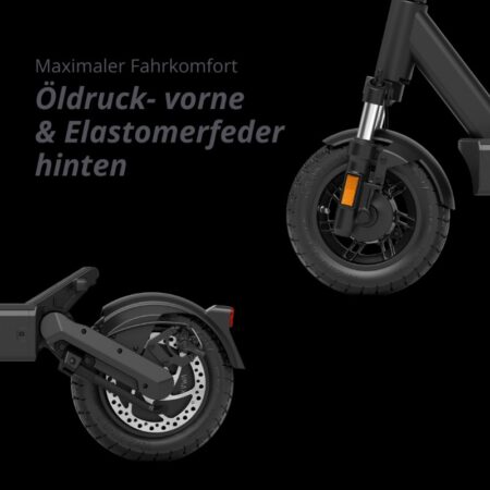 Dafür sorgt die Kombination aus einer fein dosierbaren Öldruck-Federung vorne und einer wartungsarmen Elastomer-Federung hinten. Besonders praktisch: Die vordere Federung lässt sich präzise an das Fahrergewicht anpassen – von der weichsten Stufe bei 60 kg bis zur härtesten bei voller Zuladung. Dieses individuelle Setup verleiht dem E-Scooter von VMAX ein Maß an Komfort, das man sonst nur aus höheren Fahrzeugklassen kennt.