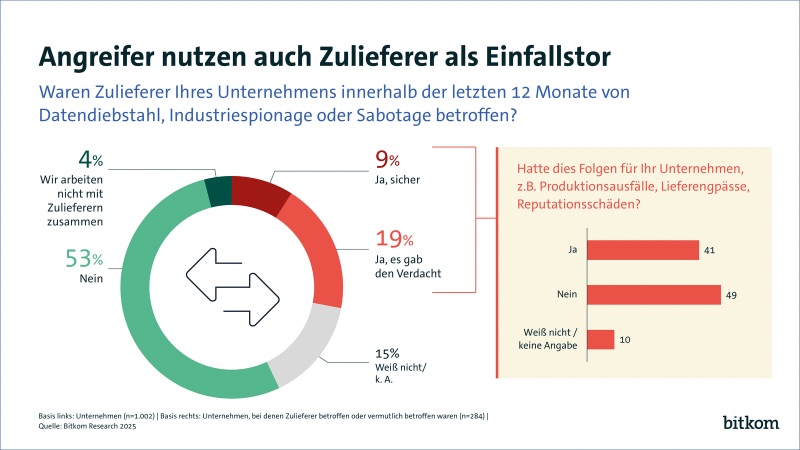 Hinweis zur Methodik: Grundlage der Angaben ist eine Umfrage, die Bitkom Research im Auftrag des Digitalverbands Bitkom durchgeführt hat. Dabei wurden 1.002 Unternehmen ab 10 Beschäftigten und einem Jahresumsatz von mindestens 1 Mio. Euro in Deutschland telefonisch befragt. Die Befragung fand im Zeitraum von KW 16 bis KW 24 2025 statt. Die Umfrage ist repräsentativ. Die Fragestellungen lauteten: „Waren Zulieferer Ihres Unternehmens innerhalb der letzten 12 Monate von Datendiebstahl, Industriespionage oder Sabotage betroffen?“ und „Hatte dieser Vorfall bzw. diese Vorfälle Folgen für Ihr Unternehmen, z.B. Produktionsausfälle, Lieferengpässe oder Reputationsschäden?“