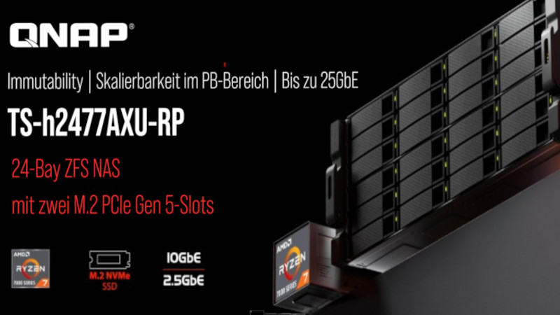 QNAP Systems, Inc., ein führender Innovator von Computer-, Netzwerk- und Speicherlösungen, stellte heute mit dem TS-h2477AXU-RP ein ZFS NAS für Unternehmen vor, das entwickelt wurde, um der wachsenden Nachfrage nach hoher Leistung, Zuverlässigkeit und flexibler E/A-Erweiterung gerecht zu werden. Mit vierundzwanzig 3,5-Zoll SATA Laufwerksschächten, zwei M.2 PCIe Gen 5 Steckplätzen, drei PCIe Gen 4 Steckplätzen und redundanten Stromversorgungen bietet das TS-h2477AXU-RP ebenfalls integrierte 2,5GbE und 10GbE Ports—und Organisationen damit eine superschnelle, zentralisierte Speicherplattform, die verschiedene Arbeitslasten und geschäftskritische Operationen unterstützt.