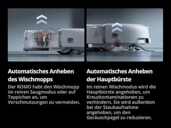 Ein weiteres Highlight sind die beiden ausfahrbaren Roboterarme. Sie werden durch Echtzeit-Kartierung und adaptive Kantenalgorithmen gesteuert und passen sich automatisch an den jeweiligen Raum an. Dadurch erreicht der ROMO P selbst schwer zugängliche Ecken oder Kanten entlang von Sockelleisten. Diese innovative Technologie sorgt für ein Reinigungsergebnis, das man sonst nur von Handarbeit kennt – gründlich, systematisch und präzise.