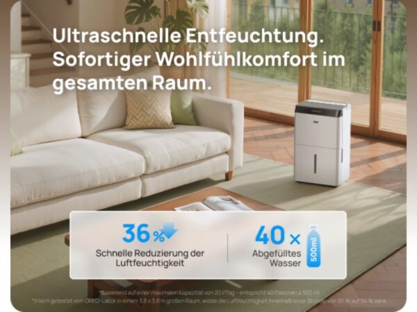 Gleichzeitig überzeugt der Luftentfeuchter von Dreo durch eine bemerkenswert effiziente Leistungsentfaltung. Die Energie wird gezielt eingesetzt, sodass das Gerät selbst bei längerer Laufzeit moderat bleibt. Im Zusammenspiel mit der intelligenten Steuerung entsteht eine Balance aus wirkungsvoller Entfeuchtung und ressourcenschonendem Betrieb.