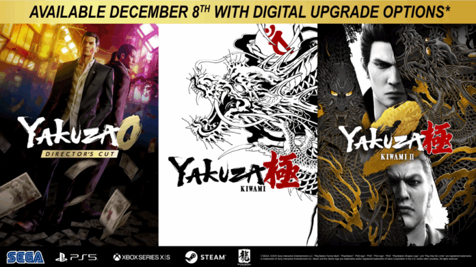 SEGA und Ryu Ga Gotoku Studio haben heute bekanntgegeben, dass die 20.-Jubiläum-Veröffentlichungen der Like a Dragon & Yakuza-Serie von Yakuza Kiwami, Yakuza Kiwami 2 und Yakuza 0 Director’s Cut auf PlayStation5, Xbox Series X|S und Steam am 8. Dezember Rabatt-Optionen für Spieler beinhalten, die die digitalen Versionen von Yakuza 0, Yakuza Kiwami und Yakuza Kiwami 2 besitzen, um ihnen für ihre unermüdliche Unterstützung der Serie zu danken.