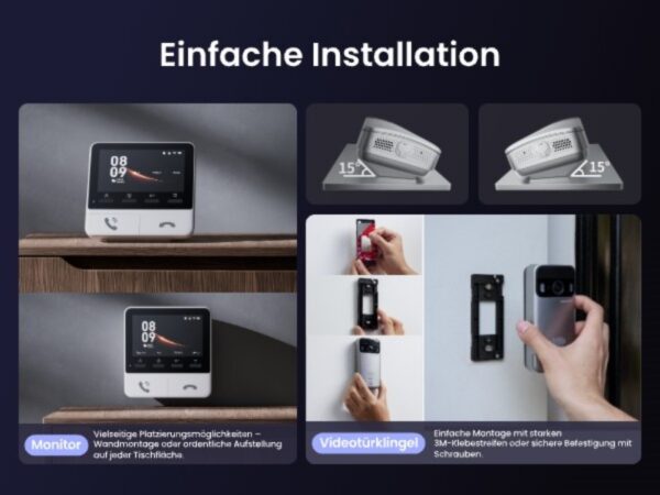 Der Monitor kann an der Wand montiert oder frei im Raum platziert werden. Er fungiert als zentrales Anzeigegerät für Besucherkommunikation, Live-Ansicht und schnelle Interaktion. Die Bedienung über den Monitor ist einfach und benutzerfreundlich, sodass auch technikunerfahrene Personen problemlos damit zurechtkommen.