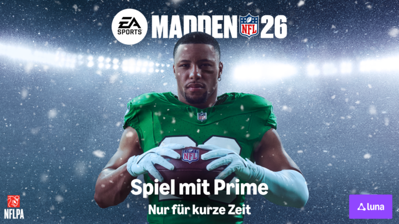 Pünktlich zu den NFL-Playoffs und zur Vorbereitung auf den Super Bowl LX können Prime-Mitglieder vom 10. Januar bis zum 10. Februar EA SPORTS Madden NFL 26 ohne zusätzliche Kosten auf Luna spielen, sofern die Luna-Cloud-Bereitstellung verfügbar ist. Alle Playoff-Spiele gibt es in der Vorschau (oder zum Replay). Man kann mit seinen Lieblingsmannschaften spielen, sein eigenes Traum-Footballteam mit NFL-Legenden und aktuellen Stars zusammenstellen und online gegen die Besten antreten.