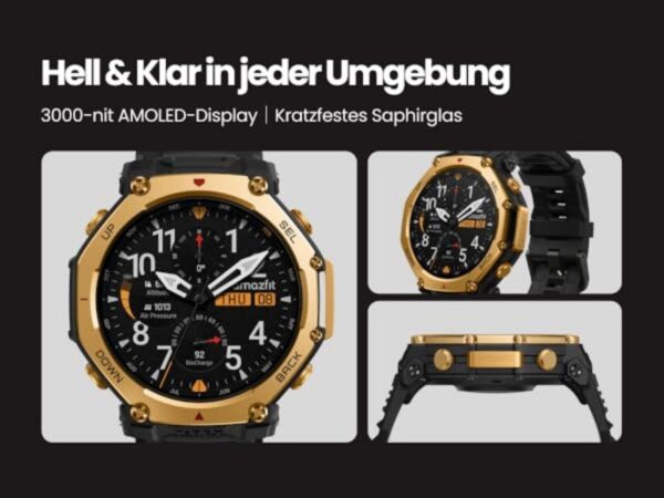 Im Mittelpunkt stehen Widerstandsfähigkeit, präzise Sensorik, lange Akkulaufzeit und ein Funktionsumfang, der sowohl ambitionierte Sportler als auch Outdoor-Enthusiasten überzeugt. Gleichzeitig bleibt die Uhr alltagstauglich, komfortabel zu tragen und modern gestaltet. Die Amazfit T-Rex 3 Pro ist damit eine Uhr für Menschen, die keine Kompromisse eingehen möchten – weder bei der Technik noch bei der Zuverlässigkeit.