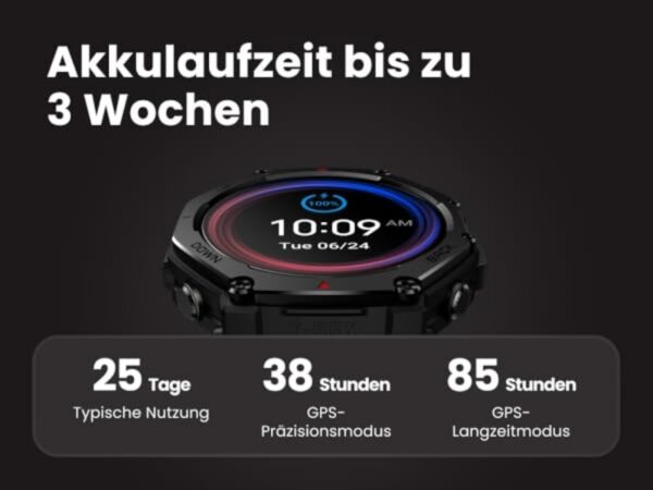 Ein entscheidender Vorteil der Amazfit T-Rex 3 Pro ist ihre starke Akkulaufzeit. Gerade bei Outdoor-Uhren ist ein ausdauernder Akku essenziell, da lange Touren oder mehrtägige Aktivitäten nicht ständig unterbrochen werden sollen. Die T-Rex 3 Pro ist genau darauf ausgelegt und hält auch bei intensiver Nutzung über längere Zeit durch.