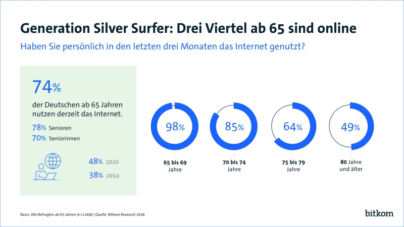 Insgesamt 74 Prozent der Internetnutzerinnen und -nutzer ab 65 Jahren können sich ein Leben ohne Internet nicht mehr vorstellen. 91 Prozent finden im Internet Freizeitaktivitäten, 78 Prozent nutzen das Netz, um gedanklich fit zu bleiben. 72 Prozent haben dank des Internets mehr Kontakt zu Freunden und Familie. „Deutschlands Seniorinnen und Senioren sind viel digitaler als gedacht. Sie erkennen die Chancen, wünschen sich mehr und schnelleren Fortschritt – und wollen dabei mitgenommen werden“, so Bitkom-Präsident Dr. Ralf Wintergerst.