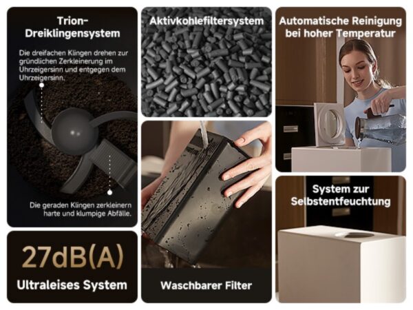Technisch verantwortlich dafür ist das dreifache Klingensystem, das in beide Richtungen rotiert und Speisereste mehrdimensional zerkleinert. Gerade Klingen kümmern sich um harte oder klumpige Bestandteile, während rotierende Elemente das Material weiter zermahlen. Laut Hersteller wird so eine Reduzierungsrate von bis zu 90 % erreicht, basierend auf einer vollen Ladung von 2,5 Litern. Die Leistungsaufnahme liegt bei 470 W, wobei ein kompletter Zyklus etwa sechs Stunden dauert. In der Praxis wirkt das System effizient, ohne unnötige Wiederholungen oder Blockaden.
