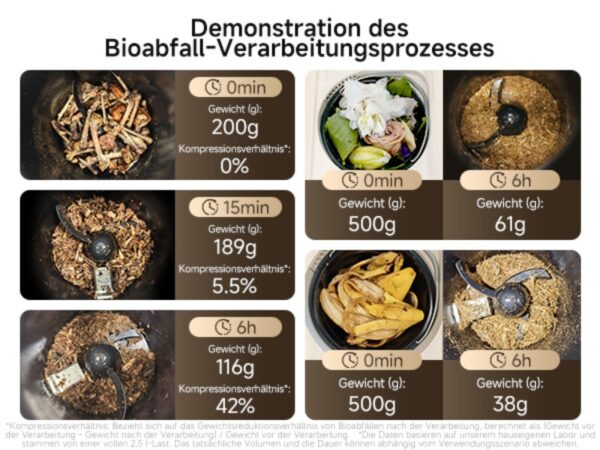 Das Volumen ist so gewählt, dass typische Küchenabfälle gesammelt und in einem Durchgang verarbeitet werden können. Laut Hersteller eignet sich das Gerät für drei- bis vierköpfige Haushalte. In der Praxis zeigt sich, dass selbst größere Kochaktionen problemlos abgedeckt werden. Durch die starke Volumenreduktion entstehen trockene Rückstände, die sich leicht entsorgen oder kompostieren lassen. Der Platzgewinn im Müllbehälter ist spürbar und sorgt langfristig für weniger Entsorgungsstress.
