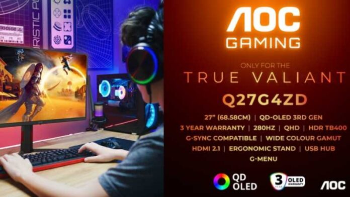 AOC Q27G4ZD 27 Zoll WQHD Monitor 280Hz, QD-OLED Panel, 0.03ms GtG, Adaptive Sync, HDR400 TrueBlack, G-Sync Compatible, Höhenverstellung, (2560x1440 HDMI 2X 2.1 DP 1x 1.4 USB Hub) Schwarz