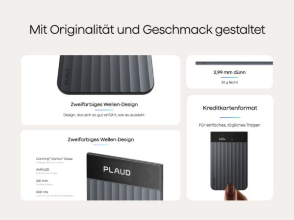 Optisch überzeugt der PLAUD Note Pro durch ein minimalistisches, professionelles Design. Das Gehäuse wirkt hochwertig verarbeitet, mit klaren Linien und einer modernen, reduzierten Formensprache. Das Gerät ist kompakt genug, um diskret getragen oder auf dem Tisch platziert zu werden, ohne Aufmerksamkeit auf sich zu ziehen.