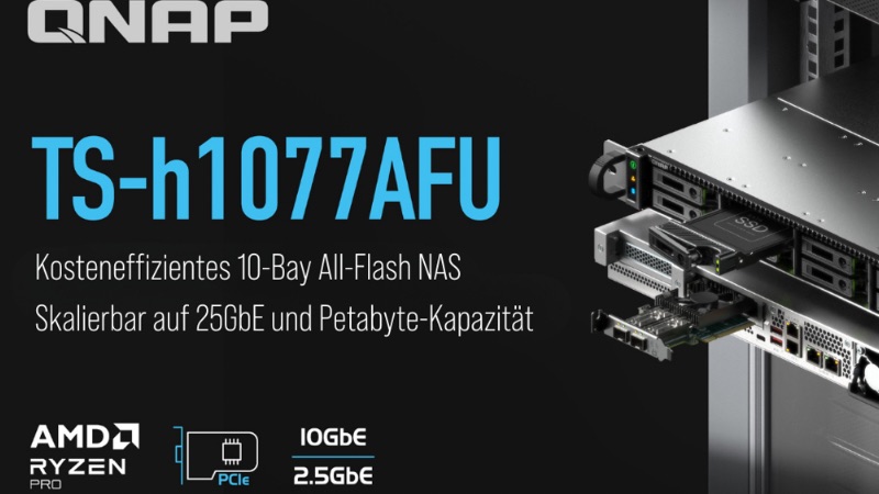 QNAP Systems, Inc., ein führender Innovator von Computer-, Netzwerk- und Speicherlösungen, hat heute mit dem TS-h1077AFU ein kompaktes 10-Bay SATA-basiertes All-Flash NAS vorgestellt, das für Unternehmen konzipiert ist, die nach einem schnellen, zuverlässigen und kosteneffizienten Flash-Speicher suchen. Auf dem ZFS-basierten Betriebssystem QuTS hero aufgebaut, mit Prozessoren der AMD Ryzen™ Pro 7000-Serie betrieben und mit ECC-DDR5-Speicher ausgestattet, liefert das TS-h1077AFU exzellente Leistung, hohe Datenintegrität und Mehrwert im Einsatz. Mit Fokus auf Geschwindigkeit, Speicherdichte und Zuverlässigkeit entwickelt, eignet sich die TS-h1077AFU ideal für die Virtualisierung, hochperformante Medien-Workflows, Datenbankbetrieb sowie die standortübergreifende Konsolidierung von Backups.