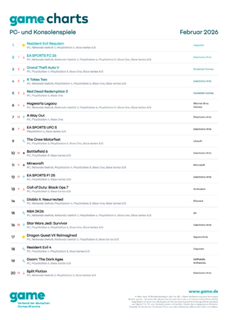 Die game Charts enthalten plattformübergreifend die am häufigsten im jeweiligen Monat in Deutschland auf Datenträgern und als Download verkauften Spiele für PCs und Spielekonsolen. Die Daten werden erhoben auf Basis von Games Sales Data (GSD), einer Plattform, die von der VGE (Video Games Europe) ins Leben gerufen wurde, um physische und digitale Verkaufszahlen von Videospielen zu messen. In Deutschland werden neben Verkäufen bei Einzelhändlern auch Verkäufe von digitalen Verkaufsplattformen wie dem Nintendo eShop, PSN, dem Xbox Store oder Steam von Publishern an GSD übermittelt. Digitale Verkäufe von Nintendo-Titeln aus dem Nintendo eShop sind nicht enthalten.
