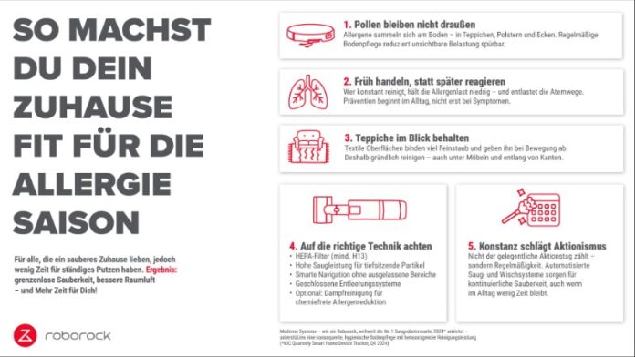 „Regelmäßiges Saugen hilft dabei, Pollen, Staub und Tierhaare gar nicht erst zu Mitbewohnern werden zu lassen. Wichtig ist vor allem: gründlich reinigen, auch dort, wo man es sonst gern übersieht – Teppiche, Ecken, unter Möbeln.“ Gerade durch die klimabedingt verlängerte Pollensaison gewinnt die regelmäßige, systematische Bodenpflege eine neue Bedeutung. Roborock, weltweit die Nr. 1 Saugrobotermarke 2024*, positioniert sich als unterstützende, präventive Technologie, die medizinisch empfohlene Maßnahmen zur Kontrolle von Umweltfaktoren im Haushalt alltagstauglich macht. Neben moderner Technik sind es vor allem einfache Alltagsroutinen, die den Unterschied machen. Für alle, die ein sauberes Zuhause lieben, aber wenig Zeit fürs ständige Putzen haben, gilt: Kleine Routinen, große Wirkung.