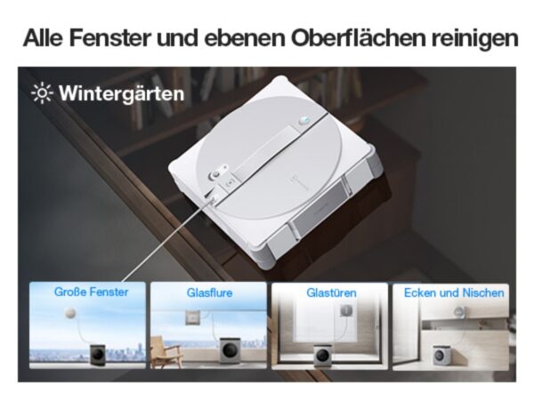 Besonders praktisch ist die Möglichkeit, auch größere Flächen effizient zu reinigen. Der Roboter arbeitet kontinuierlich und deckt große Bereiche ab, ohne dass man ständig eingreifen muss. Gerade bei modernen Wohnkonzepten mit viel Glas ist das ein enormer Vorteil.