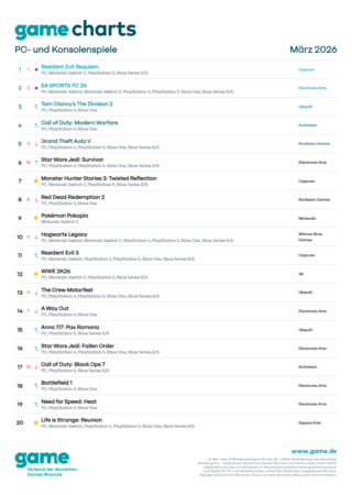 Vier neu erschienene Spieletitel haben im März direkt den Sprung in die offiziellen game Charts geschafft: Das Rollenspiel „Monster Hunter Stories 3: Twisted Reflection“ (Capcom) steigt auf Platz 7 ein und lässt die Spielenden als sogenannte „Rider“ eigene Monster großziehen und an rundenbasierten Kämpfen teilnehmen. In die Top 10 auf dem neunten Platz schafft es das Lebenssimulation-Spiel „Pokémon Pokopia“ (Nintendo), in dem man ein leeres Land in einen bunten Wohnort für zahlreiche Pokémon verwandelt. Das offizielle WWE Wrestling-Game „WWE 2K26“ (2K) konnte sich ebenfalls erfolgreich durchkämpfen und startet in seinem Veröffentlichungsmonat auf dem zwölften Platz. Die Top 20 rundet „Life is Strange: Reunion“ (Square Enix) ab. Im neuesten Mystery-Adventure der „Life is Strange“-Reihe steuern die Spielenden die bekannten Protagonistinnen Chloe und Max auf einem Abenteuer voller übernatürlicher Ereignisse. An der Spitze der Charts im März behauptet sich der Vormonatserste „Resident Evil Requiem“ (Capcom).