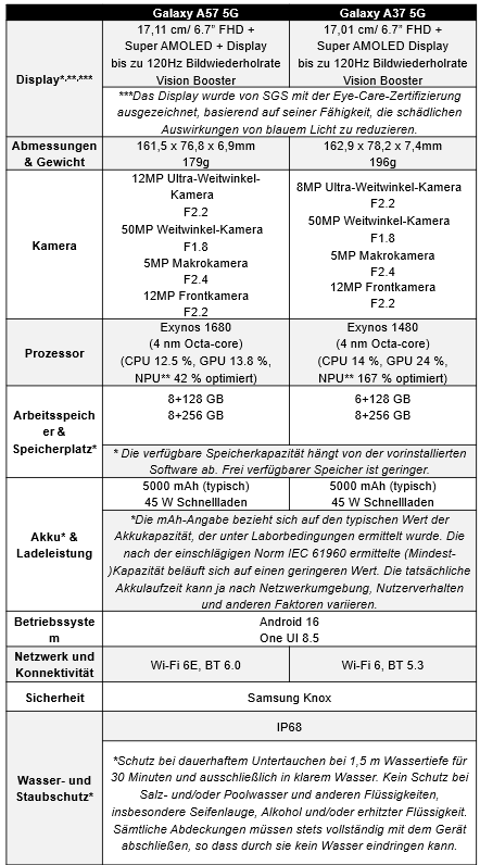 Das Samsung Galaxy A57 5G und Galaxy A37 5G sind ab sofort im Handel und im Samsung Online Shop erhältlich. Die unverbindlichen Preisempfehlungen liegen bei: