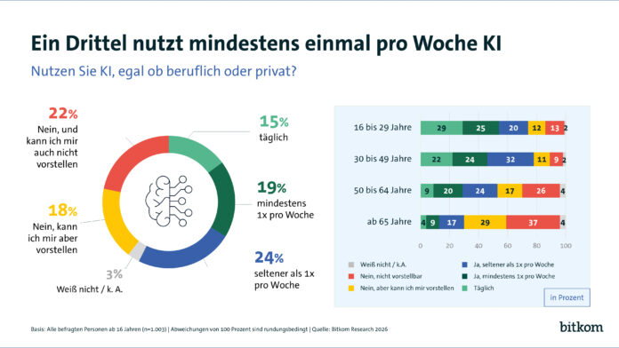 Künstliche Intelligenz hält mit hohem Tempo Einzug in den Alltag der Deutschen. Bereits jede und jeder Dritte (34 Prozent) nutzt KI mindestens einmal pro Woche, 15 Prozent sogar täglich. Unter den 16- bis 29-Jährigen verwenden 29 Prozent jeden Tag KI, bei den 30- bis 49-Jährigen sind es 22 Prozent. Insgesamt setzen 58 Prozent der Bundesbürgerinnen und Bundesbürger ab 16 Jahren KI ein. Dabei überwiegt die Chancenperspektive: 69 Prozent sehen KI eher als Chance, 27 Prozent eher als Gefahr. Allerdings nimmt die Skepsis leicht zu: Im Vorjahr waren es noch 74 Prozent bzw. 23 Prozent. Dabei gibt es deutliche Unterschiede zwischen den Altersgruppen: Während bei den 16- bis 29-Jährigen 81 Prozent KI eher als Chance sehen, sind es bei den Über-65-Jährigen nur 58 Prozent. Umgekehrt sehen 37 Prozent der Älteren KI eher als Gefahr, in der jüngsten Altersgruppe sind es nur 17 Prozent. Das sind Ergebnisse einer repräsentativen Befragung von 1.003 Personen ab 16 Jahren in Deutschland im Auftrag des Digitalverbands Bitkom. „Künstliche Intelligenz ist schneller im Alltag angekommen als jede andere Innovation zuvor“, sagt Bitkom-Präsident Dr. Ralf Wintergerst. „Deutschland muss KI nicht nur nutzen, sondern mitgestalten – und die Skeptiker dabei mitnehmen. Dazu gehört, offen über die Grenzen und Risiken von KI zu diskutieren, zugleich aber auch über die enormen Möglichkeiten der Technologie zu sprechen: zum Beispiel in der Medizin, in der Bildung, in der Forschung.“